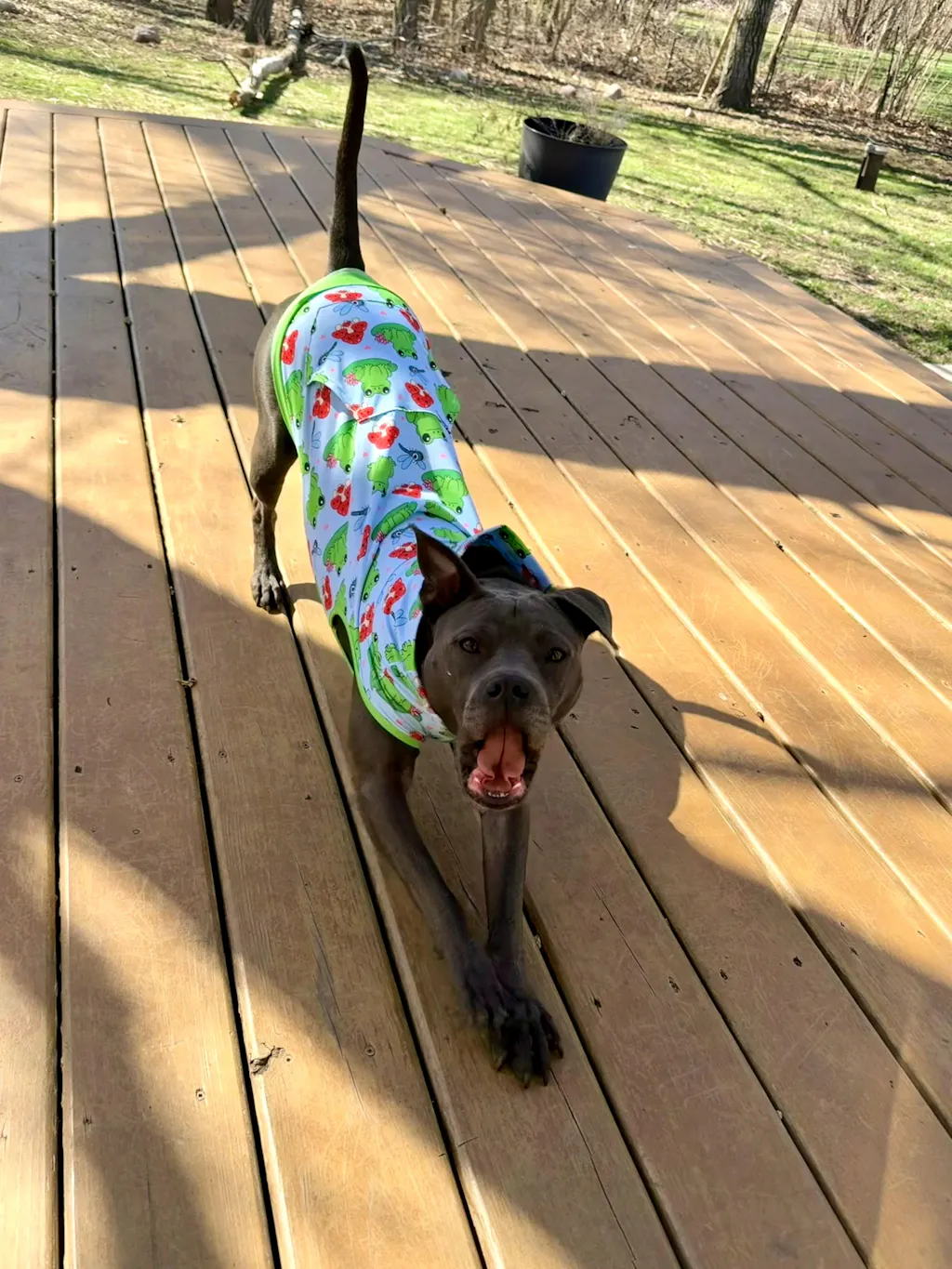 This pattern is very cute for our tomboy girl pup! We always joke about how pibbles do the "frog legs" so the fabric matches that skill for sure. Will be wearing for the rest of the spring season for sure! The size large fits her well if you like a little bit more loose fit. She is approx. 45 pounds.