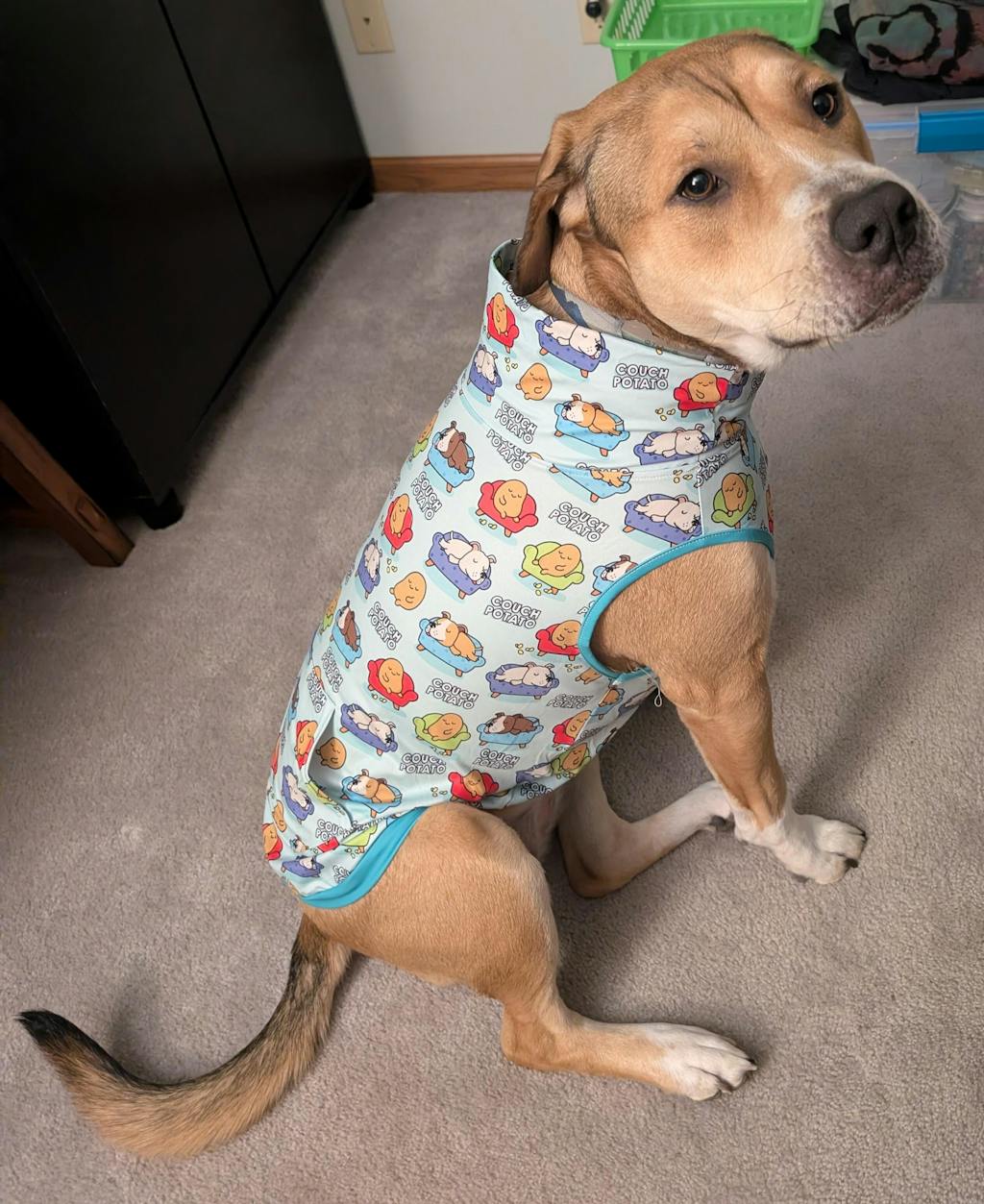 My pittie just had surgery on his side. He had stitches but the "cone of shame" was a no go. I ordered this after trying multiple doggie shirts from the pet store. None of them fit him right due to his broad chest. This tank fits him perfect though!! It covers his incision site and the tank is excellent quality. I highly recommend ordering. I plan on ordering more items.