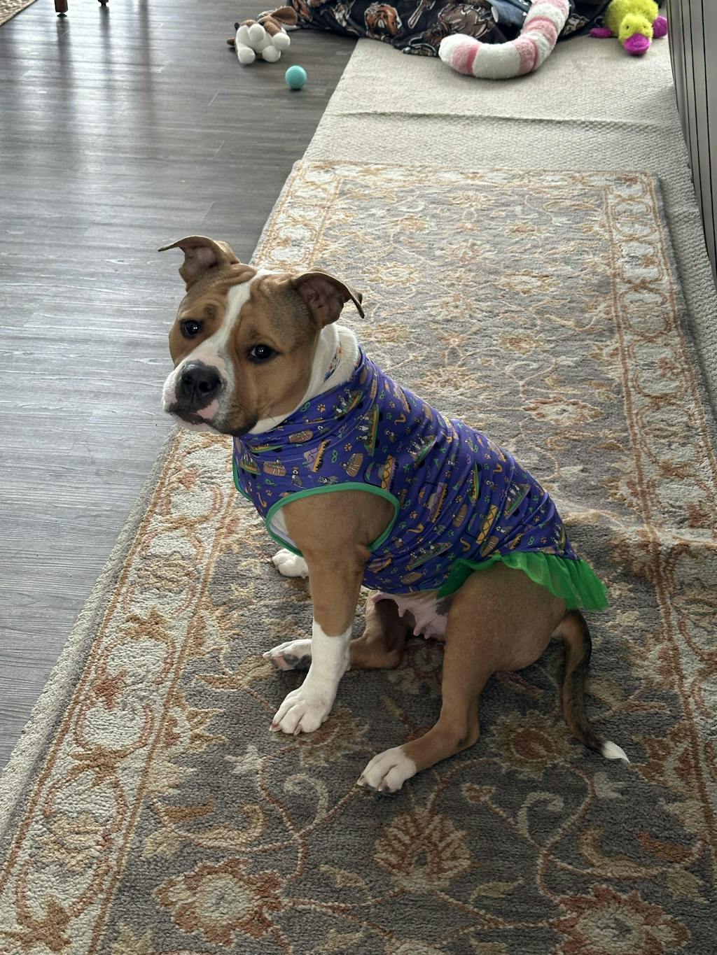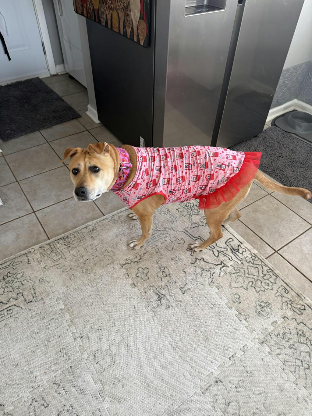 Fits my Amstaff perfectly and the soft stretchy material hugs her enough to help her feel secure while moving with her. The tutu is so sweet especially for Valentine’s Day do girly. We both just love it