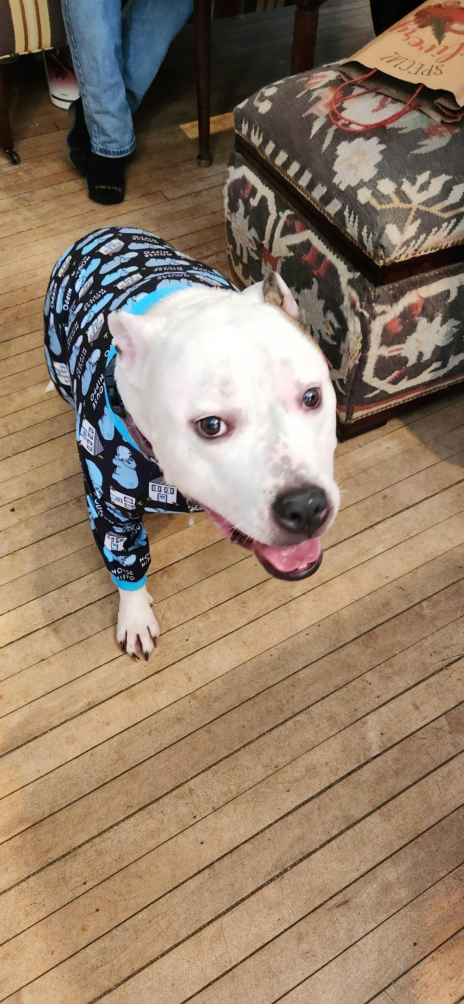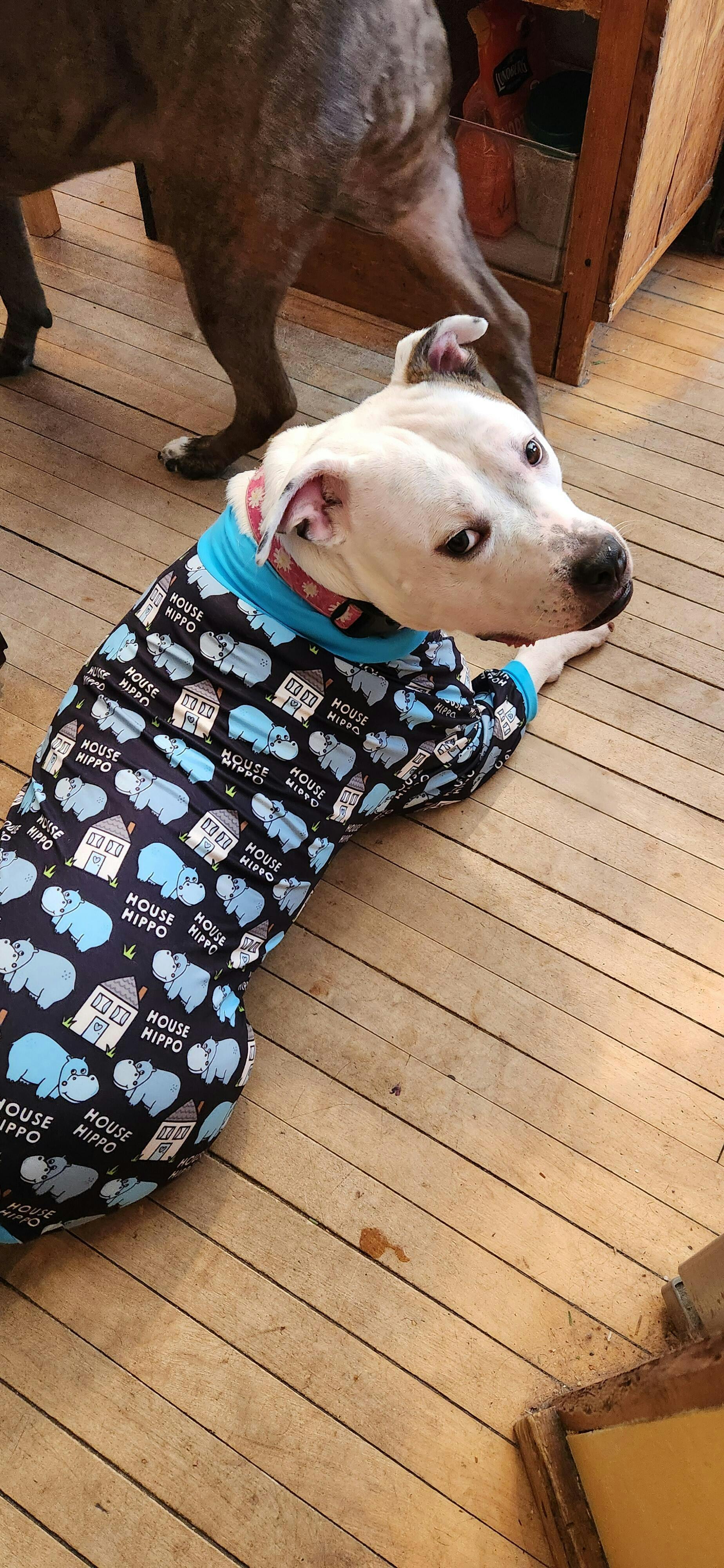 These PJ’s are adorable! Easy to get in and out of and super soft. My dog loves them and even wags his tail when I get them out. He has a muscle tee too. We just afopted a new pittie and I’ve already ordered hers.