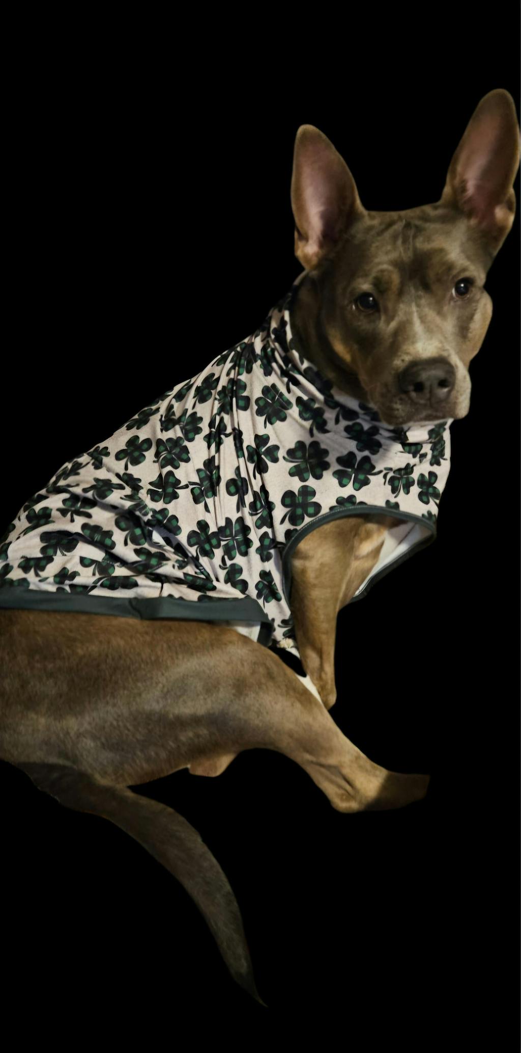 I absolutely loved this print. My Macie looks fabulous in this vibrant St. Patty's Day 4 leaf clover on the white muscle t. A lot of people dont care for the white but I love it on my "blue" pittie. Thank you so much Pittie Clothing Company for bringing a version of this back.