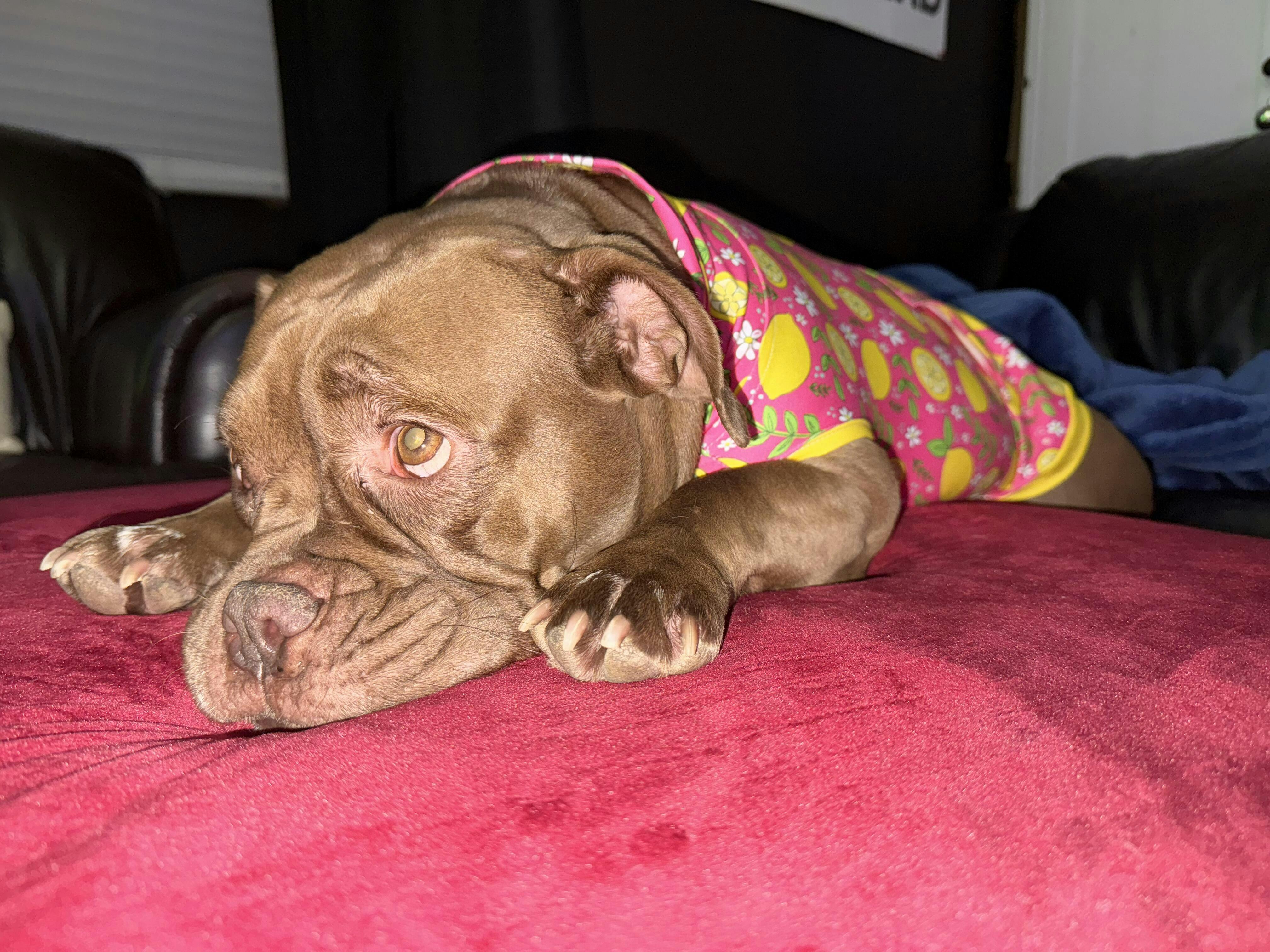 I don’t know why I waited so long to get these from you. Besides the cost. I’ll gladly pay for these Pittie clothes but they fit perfectly on my two Pitties. I would like to see some plain solid color Pittie clothes.
