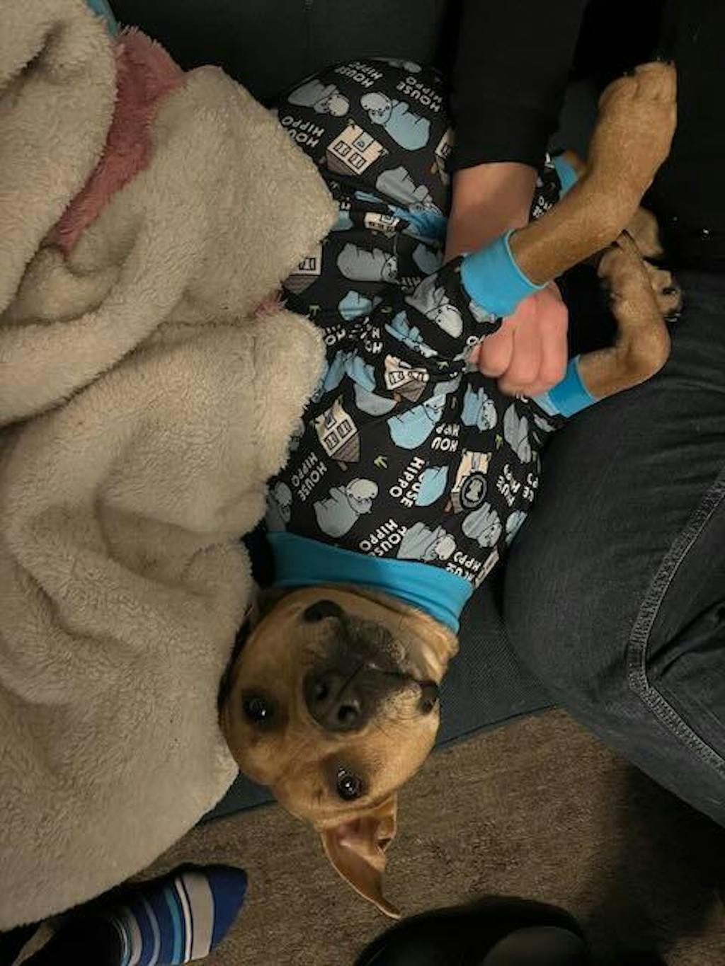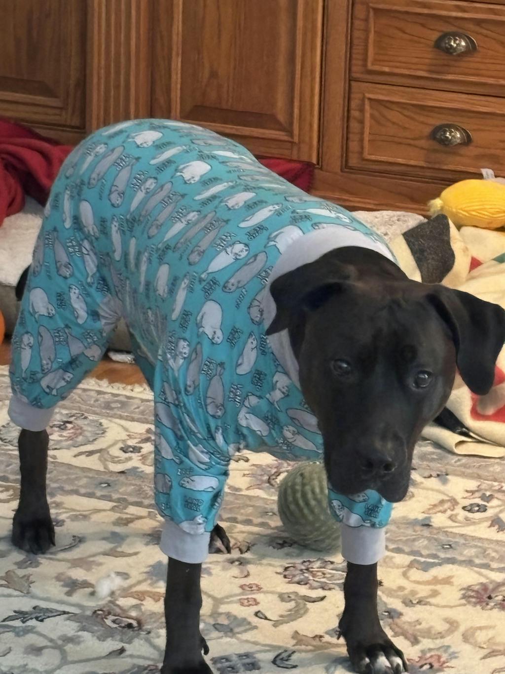 My dog is an anxious one. She listens to every sound and wants to investigate everything. Adding these adorable jammies to her evening routine has helped her calm right down for sleep. My spouse often sees her passed out in them and says, "what did you do to the dog?!" When we put them on her, she knows it's sleep time!