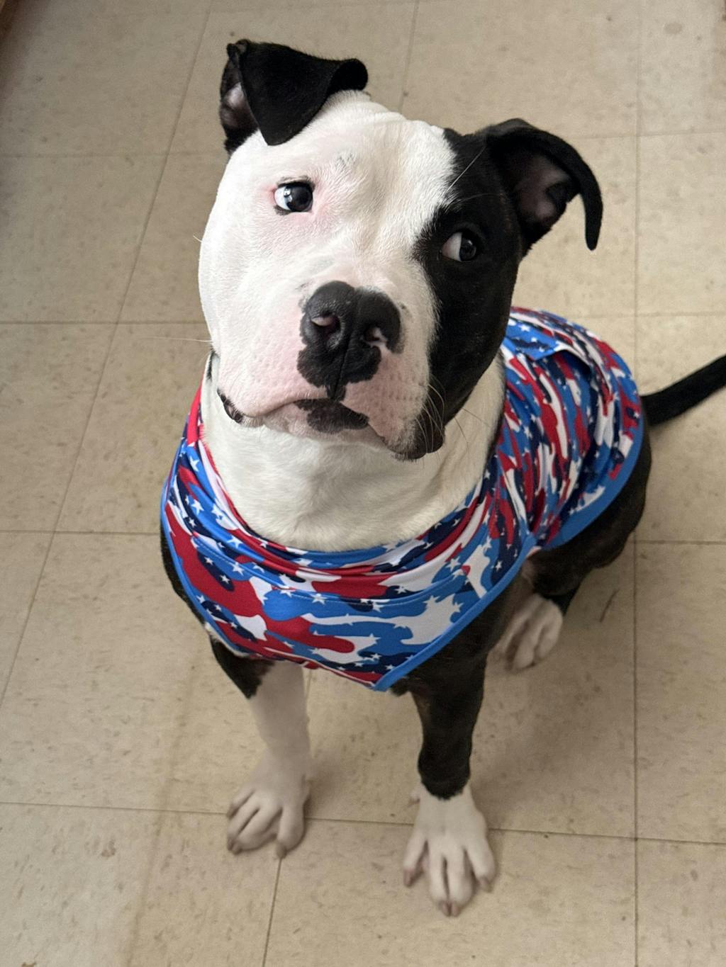Is this muscle shirt pawsitively pawtriotic?: Absolutely! Did my military husband get stupidly excited when he saw our pup in this shirt?: Excessively so… Will I purchase more muscle shirts from this site?: I already have more in my cart and my husband is telling me to buy our furbaby a wardrobe for his clothes. Overall: great quality clothing, perfect fit for my lil meatball, and pawtriotic pattern is military husband approved- only downside is when buying these amazing clothes for your Pittie it will increase their inner sassiness (see picture below).
