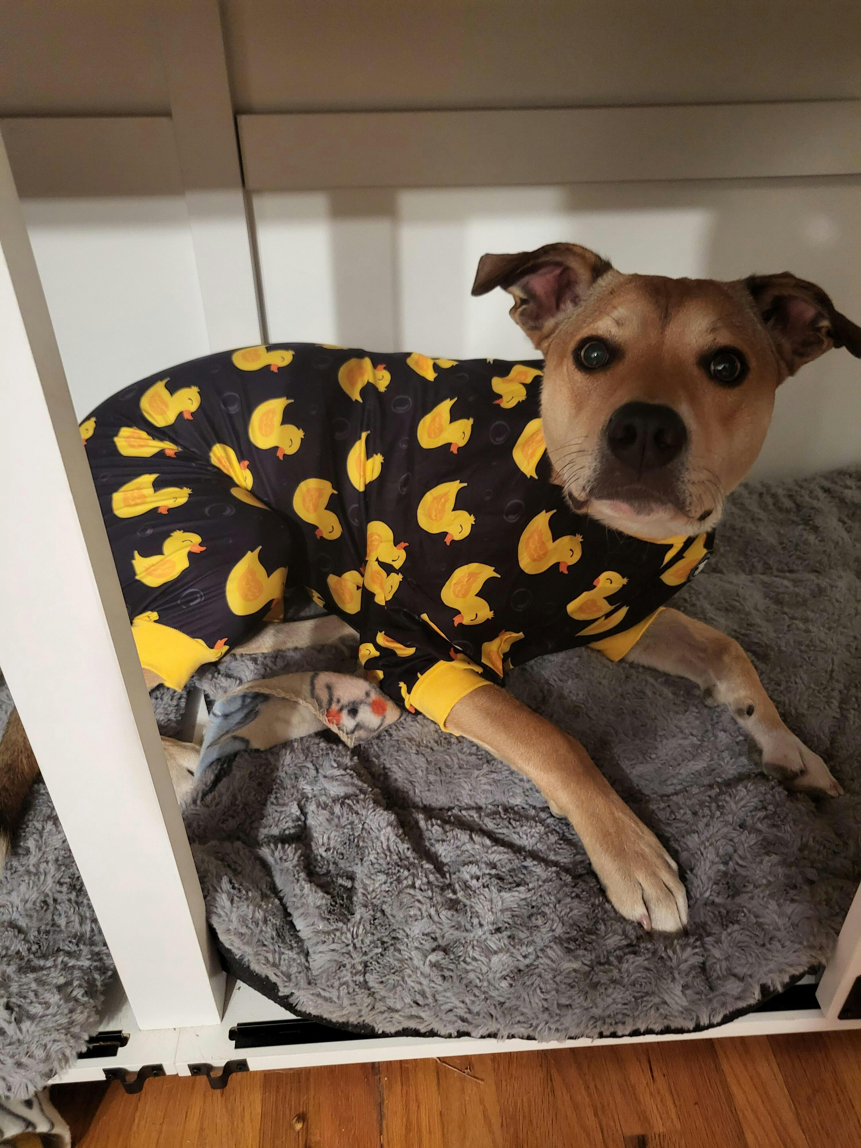 These PJ’s are adorable! Easy to get in and out of and super soft. My dog loves them and even wags his tail when I get them out. He has a muscle tee too. We just afopted a new pittie and I’ve already ordered hers.