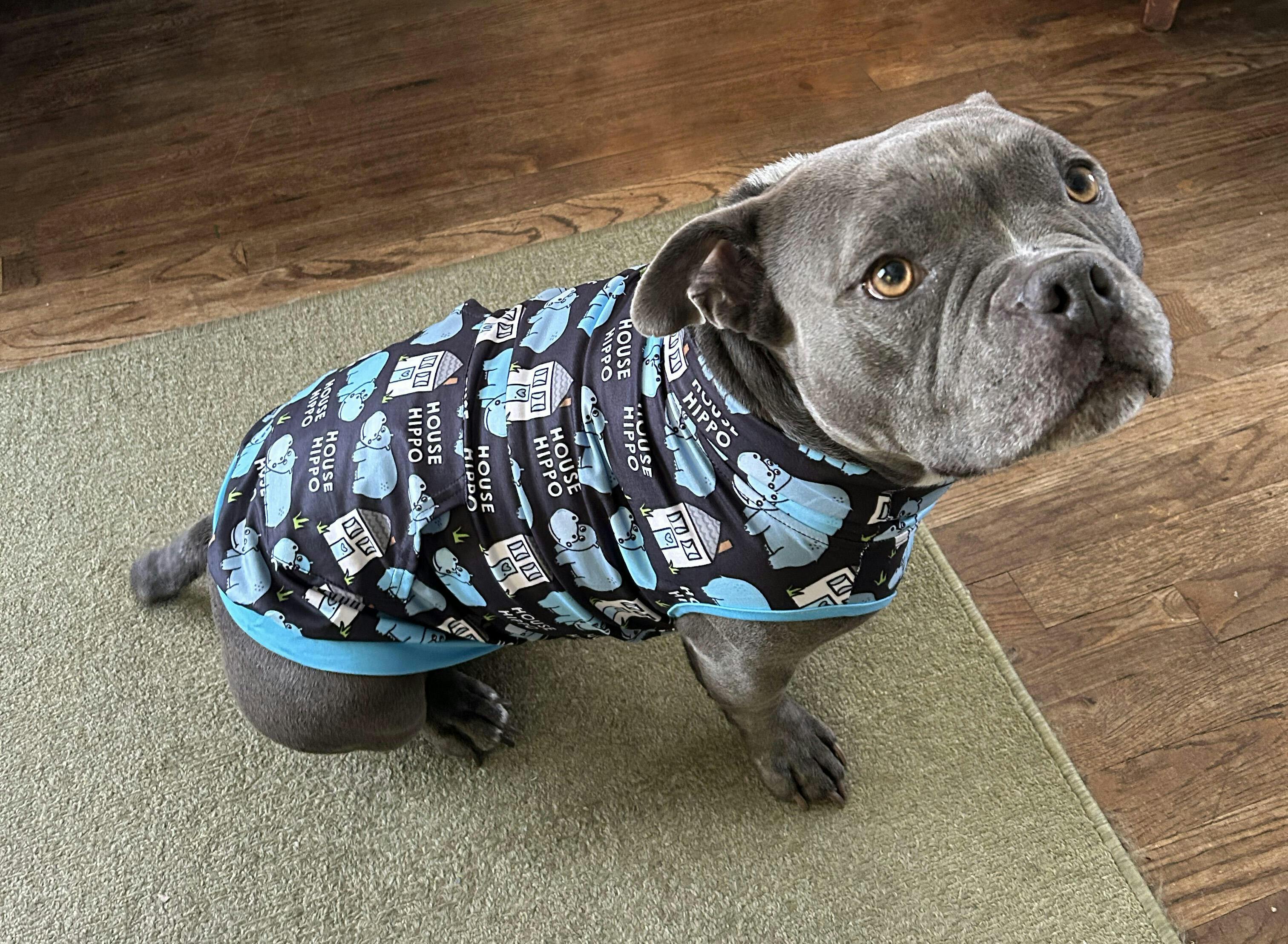 Love the house hippo fabric and this muscle tank fits my lil' pygmy house hippo (that's what I call my 43 lb staffie, haha) like it was custom made for her! The medium is just perfect — length, neck, all of it. She gets so many compliments whenever she wears this. 🤩