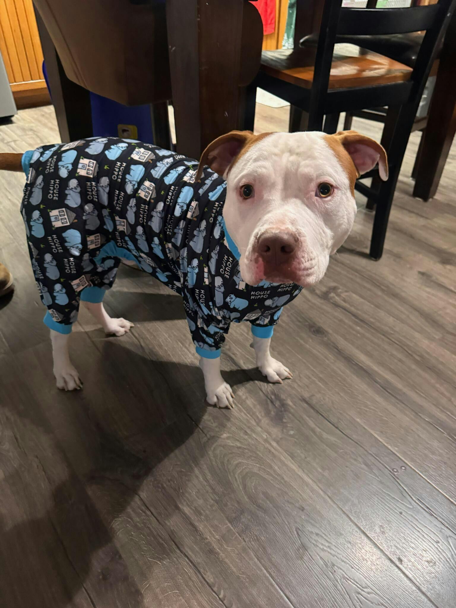 She’s so cute. My white pit enjoys her pjs. She is comfortable and adorable all at the same time.
