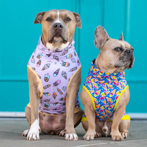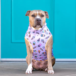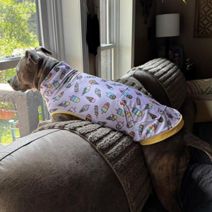 Serving up summer in style, the Paw-ple Swirl tee is a sweet blend of cool tones and creamy vibes. Featuring retro-inspired ice cream cones on a dreamy purple backdrop, this tee is made for Pit bull-type pups who bring flavor to every walk. It’s comfy, colorful, and cooler than a pup with brain freeze.