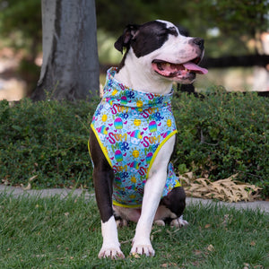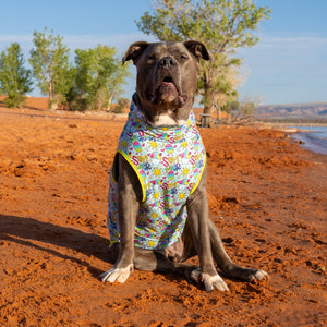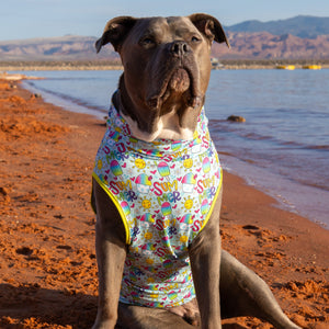 Bring the summer vibes with this bright and colorful muscle tee! Featuring fun snow cones, sunshine, and bold colors—perfect for your pup to stay cool and stylish all season long.